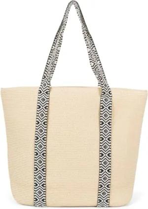 Papierstroh Strandtasche mit Azteken Muster Bändern | Damen Flechttasche mit Reißverschluss | 50 x 37 x 13 cm, Farbe:Creme