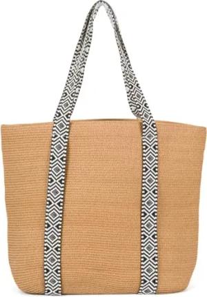 Papierstroh Strandtasche mit Azteken Muster Bändern | Damen Flechttasche mit Reißverschluss | 50 x 37 x 13 cm, Farbe:Braun