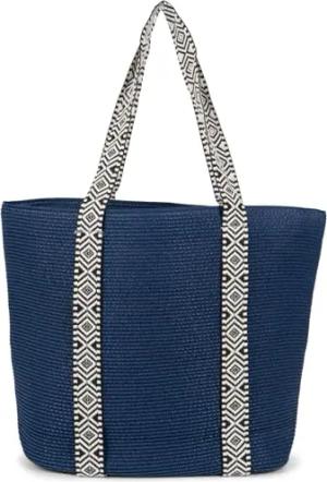 Papierstroh Strandtasche mit Azteken Muster Bändern | Damen Flechttasche mit Reißverschluss | 50 x 37 x 13 cm, Farbe:Dunkelblau