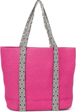 Papierstroh Strandtasche mit Azteken Muster Bändern | Damen Flechttasche mit Reißverschluss | 50 x 37 x 13 cm, Farbe:Magenta