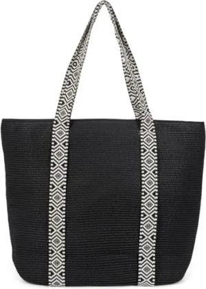Papierstroh Strandtasche mit Azteken Muster Bändern | Damen Flechttasche mit Reißverschluss | 50 x 37 x 13 cm, Farbe:Schwarz