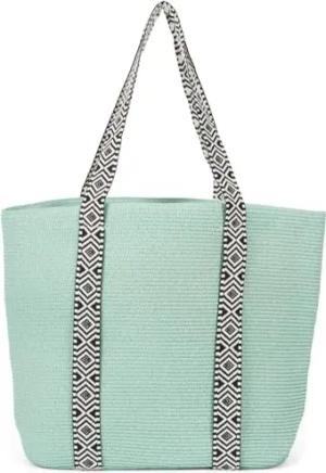 Papierstroh Strandtasche mit Azteken Muster Bändern | Damen Flechttasche mit Reißverschluss | 50 x 37 x 13 cm, Farbe:Türkis