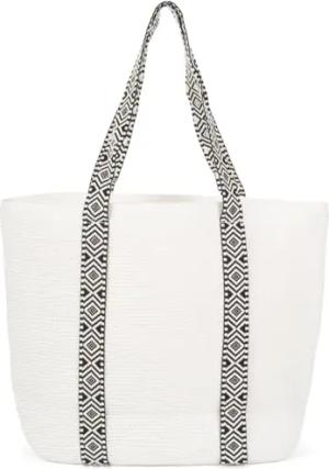 Papierstroh Strandtasche mit Azteken Muster Bändern | Damen Flechttasche mit Reißverschluss | 50 x 37 x 13 cm, Farbe:Weiß