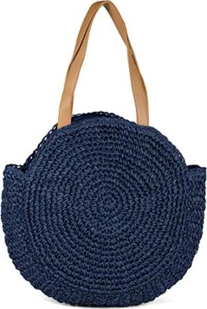 runde Damen Basttasche mit langen Henkeln | Geflochtene Korbtasche als Strandtasche oder Shopper | Großes Hauptfach mit Reißverschluss, Farbe:Dunkelblau