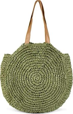 runde Damen Basttasche mit langen Henkeln | Geflochtene Korbtasche als Strandtasche oder Shopper | Großes Hauptfach mit Reißverschluss, Farbe:Oliv