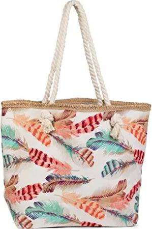 Strandtasche mit buntem Feder Muster und Bast Saum | separates Kosmetiktäschchen | Reißverschluss | 47 x 32 x 15 cm | Damen Shopper Badetasche, Farbe:Creme-Beige