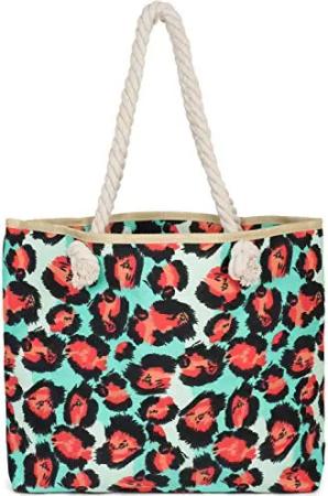 Strandtasche mit buntem Leoparden Print | Damen Shopper mit Kordelhenkel und Reißverschluss | Badetasche mit Animal Print | 48 x 37 x 12 cm, Farbe:Türkis-Rot