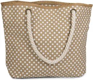 Strandtasche mit Punkte Muster und Kordelgriffen | großes Hauptfach mit Reißverschluss | inkl. abnehmbarer Kosmetiktasche | Shopper Damen mit Bast-Detail, Farbe:Beige-Weiß