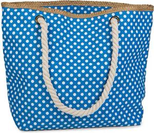 Strandtasche mit Punkte Muster und Kordelgriffen | großes Hauptfach mit Reißverschluss | inkl. abnehmbarer Kosmetiktasche | Shopper Damen mit Bast-Detail, Farbe:Blau-Weiß