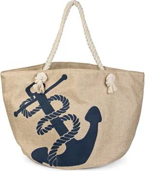 XXL Strandtasche mit Anker Print | maritimer Look in Flechtoptik | Shopper Badetasche 57 x 33 x 32 cm, Farbe:Beige-Blau