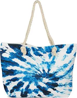 XXL Strandtasche mit Batik Wirbel Muster | Damen Shopper mit Reißverschluss und Kordelhenkel | Badetasche im Boho Look | 56 x 38 x 17 cm, Farbe:Weiß-Blau