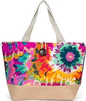 XXL Strandtasche mit buntem Blumen Print | Große Schultertasche mit Knebelknopf, Stoffhenkel & Karabiner | Damen Shopper 56 x 36 x 18 cm, Farbe:Violett-Rot-Grün