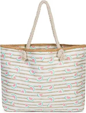 XXL Strandtasche mit Melonen Print und Streifen | Damen Shopper mit Kordelhenkeln und Reißverschluss | Badetasche mit Früchte Muster | 59 x 38 x 15 cm, Farbe:Taupe-Weiß