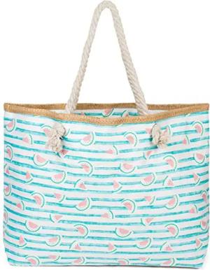 XXL Strandtasche mit Melonen Print und Streifen | Damen Shopper mit Kordelhenkeln und Reißverschluss | Badetasche mit Früchte Muster | 59 x 38 x 15 cm, Farbe:Türkis-Weiß