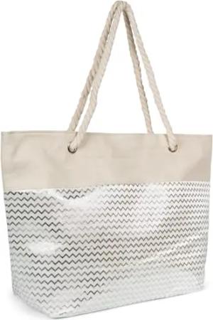 XXL Strandtasche mit metallic Zick-Zack Muster | große Damen Schultertasche mit Kordelgriffen & Reißverschluss | Shopper 58,5 x 36,5 x 16 cm, Farbe:Beige-Silber