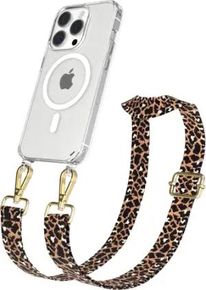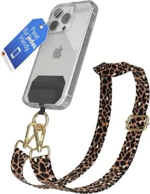 Handykette - Verstellbares Taschenband kompatibel mit iPhone 15 Pro, Schulterriemen, Handykordel mit Silikon Hülle, Qi Charging kompatibel, Umhängetasche, Leo - Schwarz Braun Gold