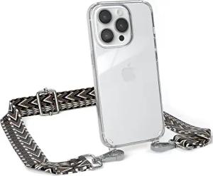 Handykette - Verstellbares Taschenband kompatibel mit iPhone 14 Pro, Schulterriemen, Handykordel mit Silikon Hülle, Umhängetasche, Leo - Schwarz Beige Silber