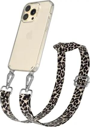 Handykette - Verstellbares Taschenband kompatibel mit iPhone 16 Pro, Schulterriemen, Handykordel mit Silikon Hülle, Umhängetasche, Leo - Schwarz Beige Silber