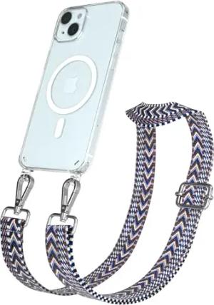 Handykette - Verstellbares Taschenband kompatibel mit iPhone 15 Plus, Schulterriemen, Handykordel mit Silikon Hülle, Qi Charging kompatibel, Umhängetasche, Blau Weiß Silber