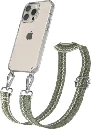 Handykette - Verstellbares Taschenband kompatibel mit iPhone 15 Pro, Schulterriemen, Handykordel mit Silikon Hülle, Umhängetasche, Grün Beige Silber
