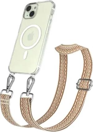 Handykette - Verstellbares Taschenband kompatibel mit iPhone 15, Schulterriemen, Handykordel mit Silikon Hülle, Qi Charging kompatibel, Umhängetasche, Beige Braun Silber