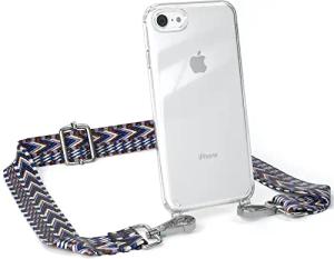 Handykette - Verstellbares Taschenband kompatibel mit iPhone SE (2022/2020) / iPhone 8/7, Schulterriemen, Handykordel mit Silikon Hülle, Umhängetasche, Blau Weiß Silber
