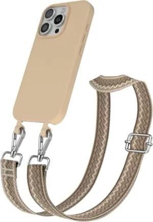 Handykette - Verstellbares Taschenband kompatibel mit iPhone 15 Pro, Schulterriemen, Handykordel mit Silikon Hülle, Umhängetasche, Beige Braun Silber