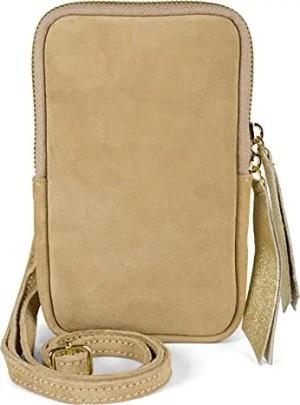 Damen Leder Handy Umhängetasche aus weichem Veloursleder, Reißverschluss, Echtleder Mini Bag 02012373, Farbe:Hellbraun