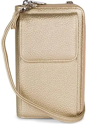 Damen Mini Bag Geldbörse mit RFID Schutz und Handyfach | Crossbody Umhängetasche mit Schultergurt | Portemonnaie und Handytasche in einem | 19 x 11 x 5,5 cm, Farbe:Gold