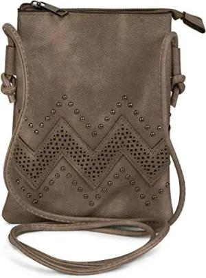 Damen Mini Bag Umhängetasche mit Zick-Zack Cutout und Nieten, Schultertasche, Handtasche, Tasche 02012211, Farbe:Taupe