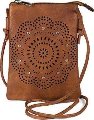 Damen Mini Umhängetasche mit Blumen Lasercut Cutout Muster und Strass | kleine Crossbody Bag Schultertasche Handytasche 14,5 x 19 cm, Farbe:Cognac