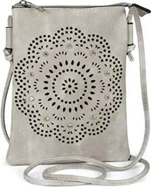 Damen Mini Umhängetasche mit Blumen Lasercut Cutout Muster und Strass | kleine Crossbody Bag Schultertasche Handytasche 14,5 x 19 cm, Farbe:Hellgrau