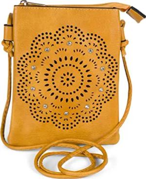 Damen Mini Umhängetasche mit Blumen Lasercut Cutout Muster und Strass | kleine Crossbody Bag Schultertasche Handytasche 14,5 x 19 cm, Farbe:Senf