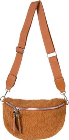 Damen Teddyfell Halbmond Crossbody Schultertaschen Einfarbig, verstellbarer Schultergurt 02012403, Farbe:Cognac