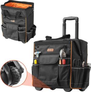 Werkzeugtasche mit Rollen, 50 kg Tragkraft, 25 Taschen, Arbeitsrucksack, verstellbarer Teleskopgriff & stabiler Standfuß, Werkzeugtaschen-Organizer für Bau, Mechanik, 390x290x420 mm