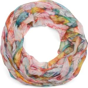 Damen Loop Schal mit buntem Feder Muster, leichter sommerlicher Boho Schlauchschal mehrfarbig 01016239, Farbe:Gelb-Blau-Rot