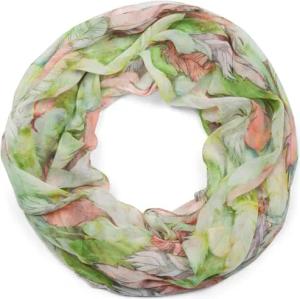 Damen Loop Schal mit buntem Feder Muster, leichter sommerlicher Boho Schlauchschal mehrfarbig 01016239, Farbe:Grün-Orange