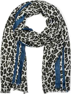 Damen Schal mit Leo Muster und farbigem Streifen | Weiches Material mit Fransen | Animal Print Tuch in One Size, Farbe:Oliv-Blau