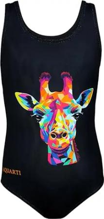 Badeanzug Mädchen – Sportlicher Mädchen Badeanzug mit Ringerrücken Print, Farbe: Bunte Giraffe/Schwarz, Größe: 116