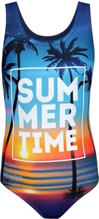 Badeanzug Mädchen – Sportlicher Mädchen Badeanzug mit Ringerrücken Print, Farbe: Summer/Time/Dunkelblau/Orange/Lila, Größe: 116