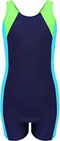 Mädchen Badeanzug mit Bein Ringerrücken – Sport Badeanzug Mädchen mit Bein und Racerback, Chlorresistent, Farbe: Dunkelblau/Neongrün/Hellblau, Größe: 170