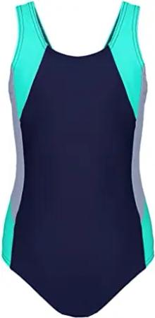 Mädchen Badeanzug mit Ringerrücken – Sport Badeanzug Mädchen, Chlorresistent, Farbe: Dunkelblau/Grau/Grün, Größe: 146