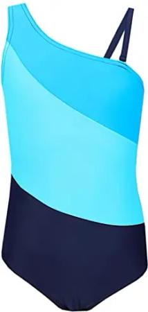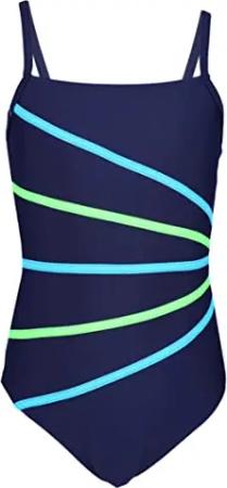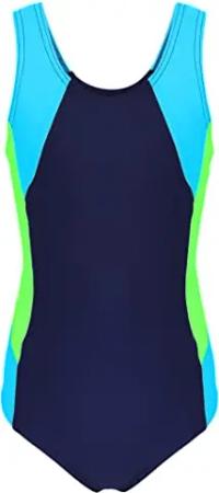 Mädchen Badeanzug mit Ringerrücken – Sport Badeanzug Mädchen, Chlorresistent, Farbe: Dunkelblau/Neongrün/Hellblau, Größe: 140