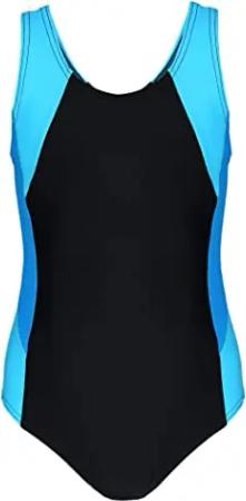 Mädchen Badeanzug mit Ringerrücken – Sport Badeanzug Mädchen, Chlorresistent, Farbe: Schwarz/Türkis/Himmelblau, Größe: 140