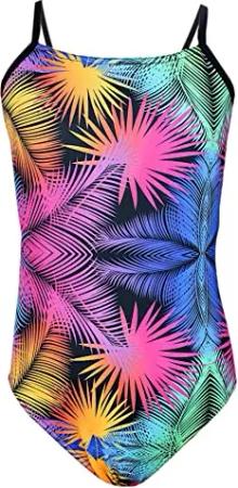 Mädchen Badeanzug mit Spaghettiträgern Streifen – Sport Badeanzug Mädchen, Chlorresistent, Farbe: Bunte Blätter/Schwarz/Pink/Orange, Größe: 146