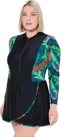 Damen große Größen Übergrößen Plus Size Badekleid, Dschungel, Softcups, Stehkragen, Langarm schwarz 46+ 836452100-46+