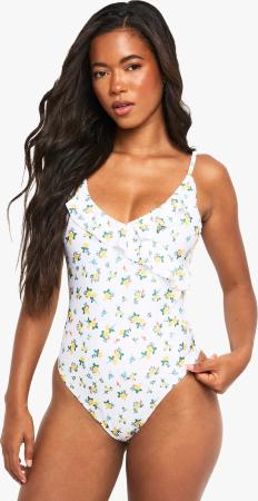 Womens Ditsy Floral Print Ruffle Detail Scoop Swimsuit - White - 38, White