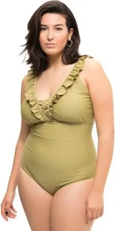 Damen große Größen Übergrößen Plus Size Badeanzug, Softcups, Volant hellkhaki 50 829010634-50