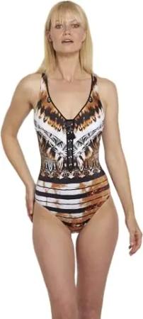 Badeanzug Einteiler mit eingearbeiteten Softschalen hoher Rückenausschnitt braunes wildes Muster verstellbare und aushakbare Träger