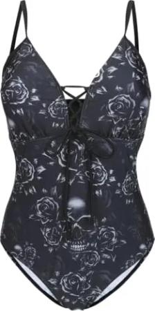 Damen schwarzer Badeanzug mit Schnürung und Rosen L